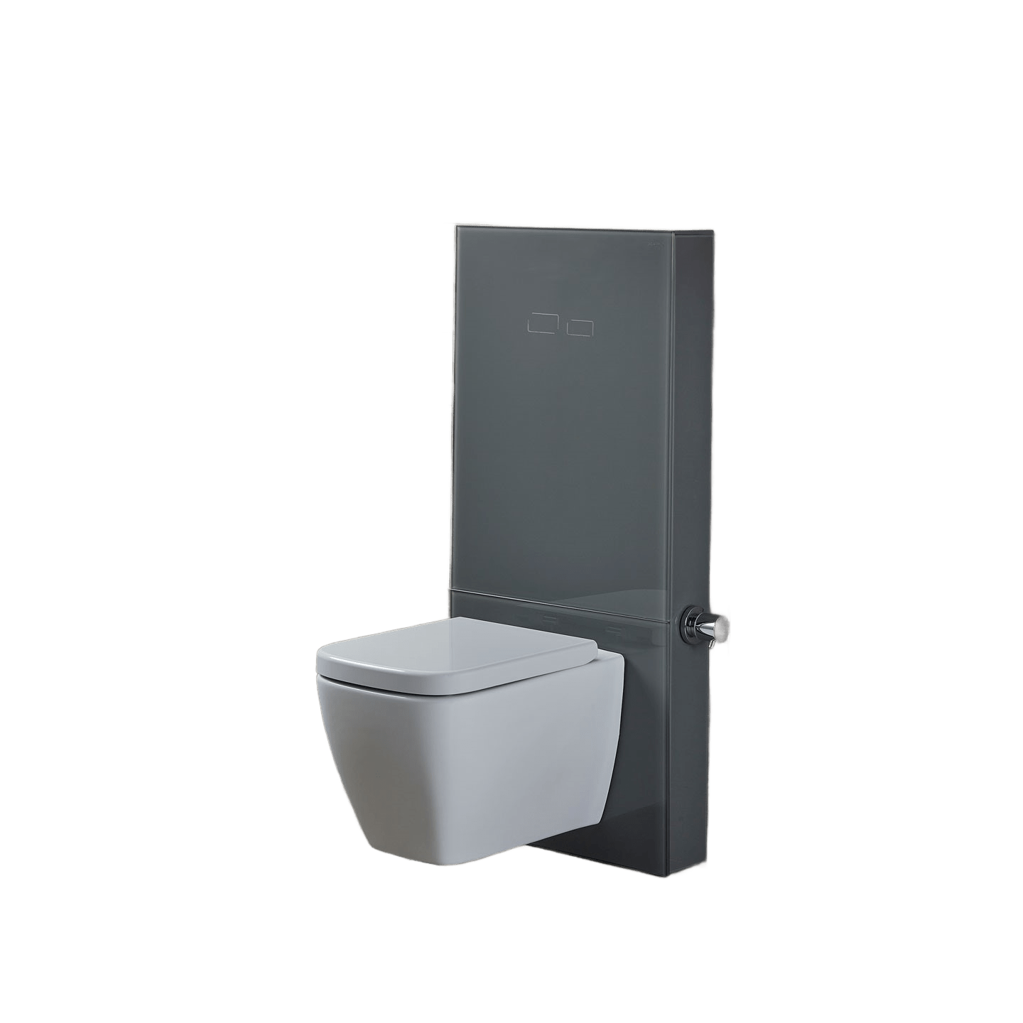 Ce réservoir encastré avec façade en verre gris et commande sans contact combine design élégant, technologie hygiénique et confort d’utilisation, parfait pour une salle de bain contemporaine.