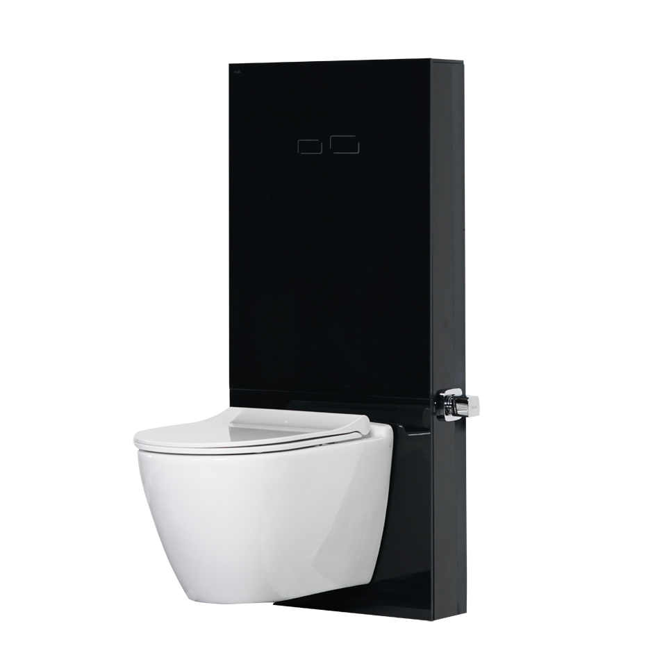 Ce réservoir encastré avec façade en verre noir et commande sans contact associe design élégant, technologie hygiénique et confort d’utilisation, idéal pour une salle de bain contemporaine.